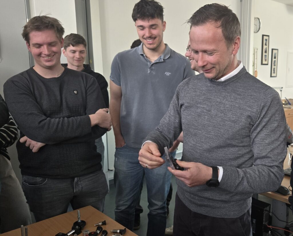 Besonderes Interesse weckte die praktische Demonstration zur Nutzung der CAD‑Daten auf der firmeneigenen Homepage. Herr Schichtl veranschaulichte, wie Konstrukteurinnen und Konstrukteure schnell und effizient passende 3D‑Modelle finden, konfigurieren und in ihre Projekte integrieren können. Zusätzlich bestand für unsere Schüler die Möglichkeit, ausgewählte Normteile im Rahmen einer kleinen Ausstellung unter die Lupe zu nehmen.